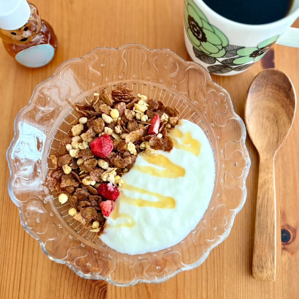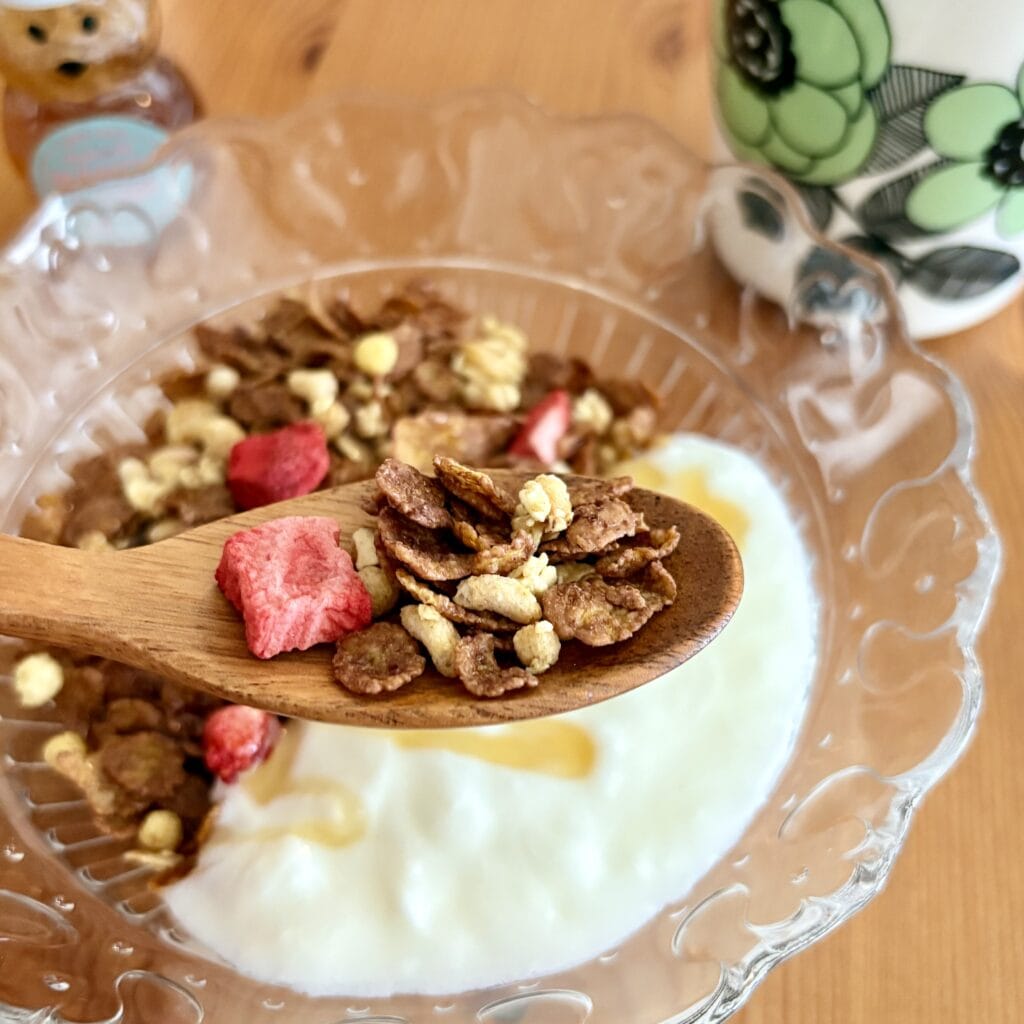 グラノラの他は牛乳や豆乳、ヨーグルトが冷蔵庫にあれば隙間時間にもサッと食べられて、栄養もばっちり補給できるのがうれしい!葉酸や鉄分もしっかり摂れるので、妊娠中だったり産後にもぴったりだと思います。