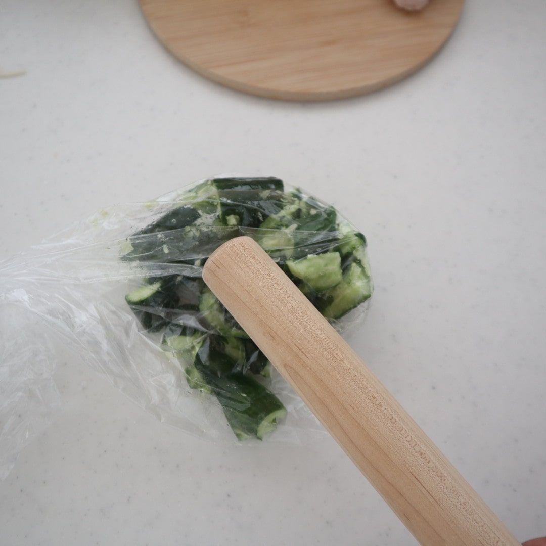 サラダチキン1/2枚は食べやすく手で裂き、きゅうり1本はめん棒で叩いて食べやすいサイズに♪