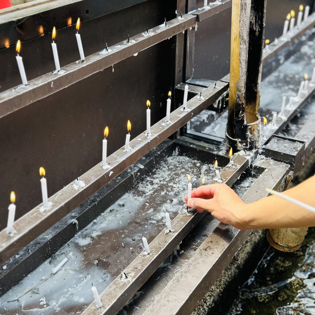 水の中を歩きながら、献灯台にて事前に手渡されたろうそくに火をつけ献灯します。
