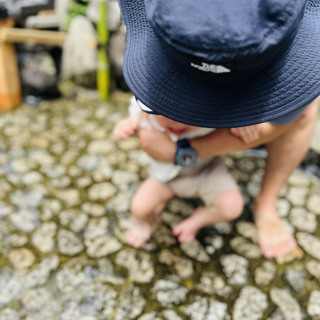 普段、水遊びなど大好きで好奇心旺盛な次女。それでもいきなり冷たい水に足をつけさせられてびっくりしたのか、大号泣でした。(ちなみに3年前の長女の時も全く同じ反応)