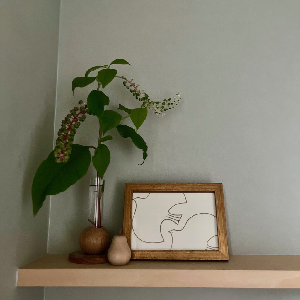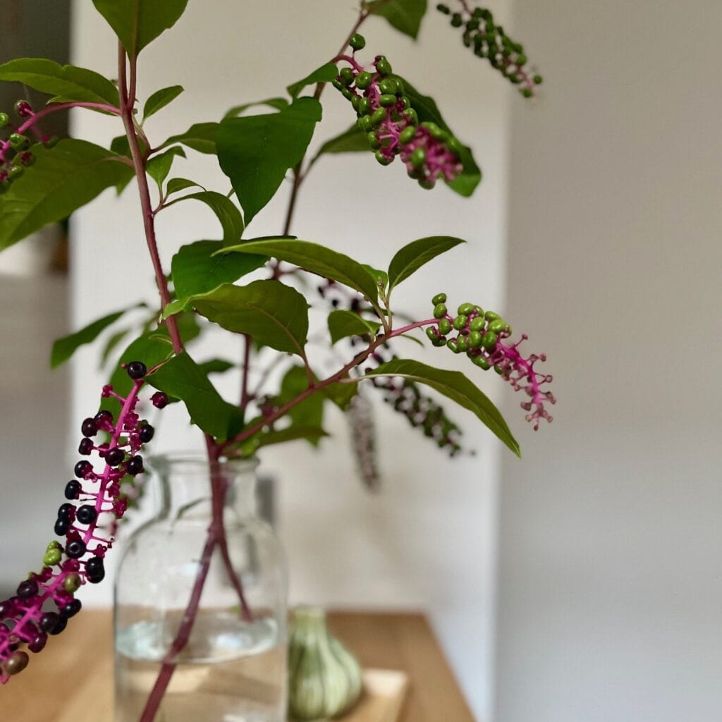 ブドウのような実の重さで、ゆらゆらと枝に動きが出るところが表情豊かで、眺めるたびに癒やされます。ちなみに、「ヤマゴボウ」という名称ですが、茎や実は毒性があるようなので食べられません。