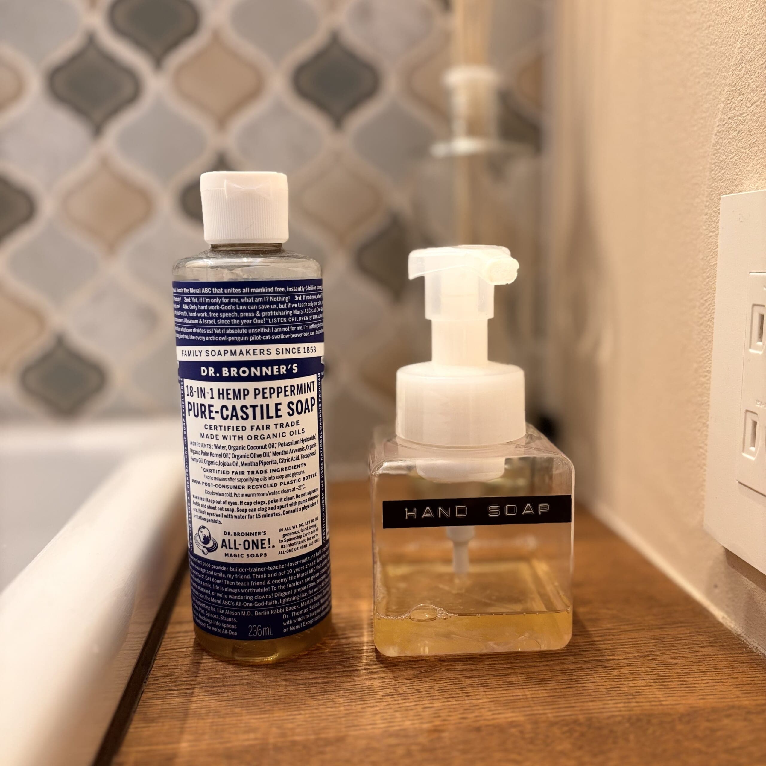 じゃあ家族は何を使ってるんだいというと、こちらマジックソープを希釈して無印の泡のボトルに詰め替えたハンドソープを使用。