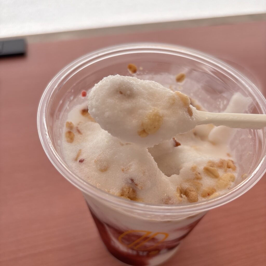 ー何を書いているの?と思われそうですが…。ミルク感強めでも、ミルク風味でもない、ヨーグルトでもない、ヨーグルト風味。だからいいんです。シャリシャリっとしたややあっさりめのヨーグルト風味。だから、後味に水分PLEASEにならなかったな。ひんやりデザート食べた疲れ(そんなのあるとしたら(笑))なしでした。この「ひんやりデザート食べ疲れ」最近感じます。。