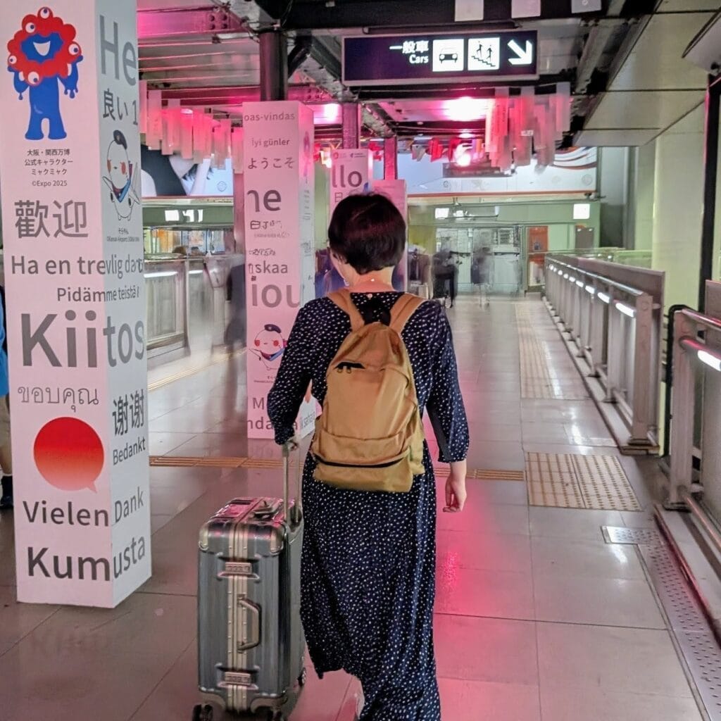 ミャクミャクさんも行ってらっしゃいの浮かれた私の後ろ姿。ワンピースを着ることでリラックスして機内食を楽しむ気満々! これが後々、作戦負けすることはまだ知らず…。