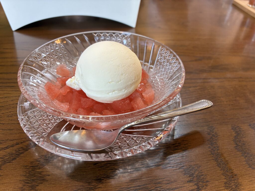 駐車場横の茶店の氷アイス(苺味)にて旅の締めくくり。