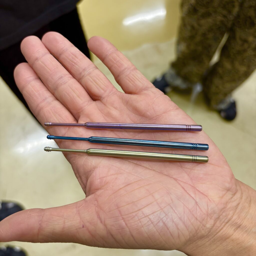 私たちも爪切りと耳かきで電気を流して色をつける体験をさせてもらいました。