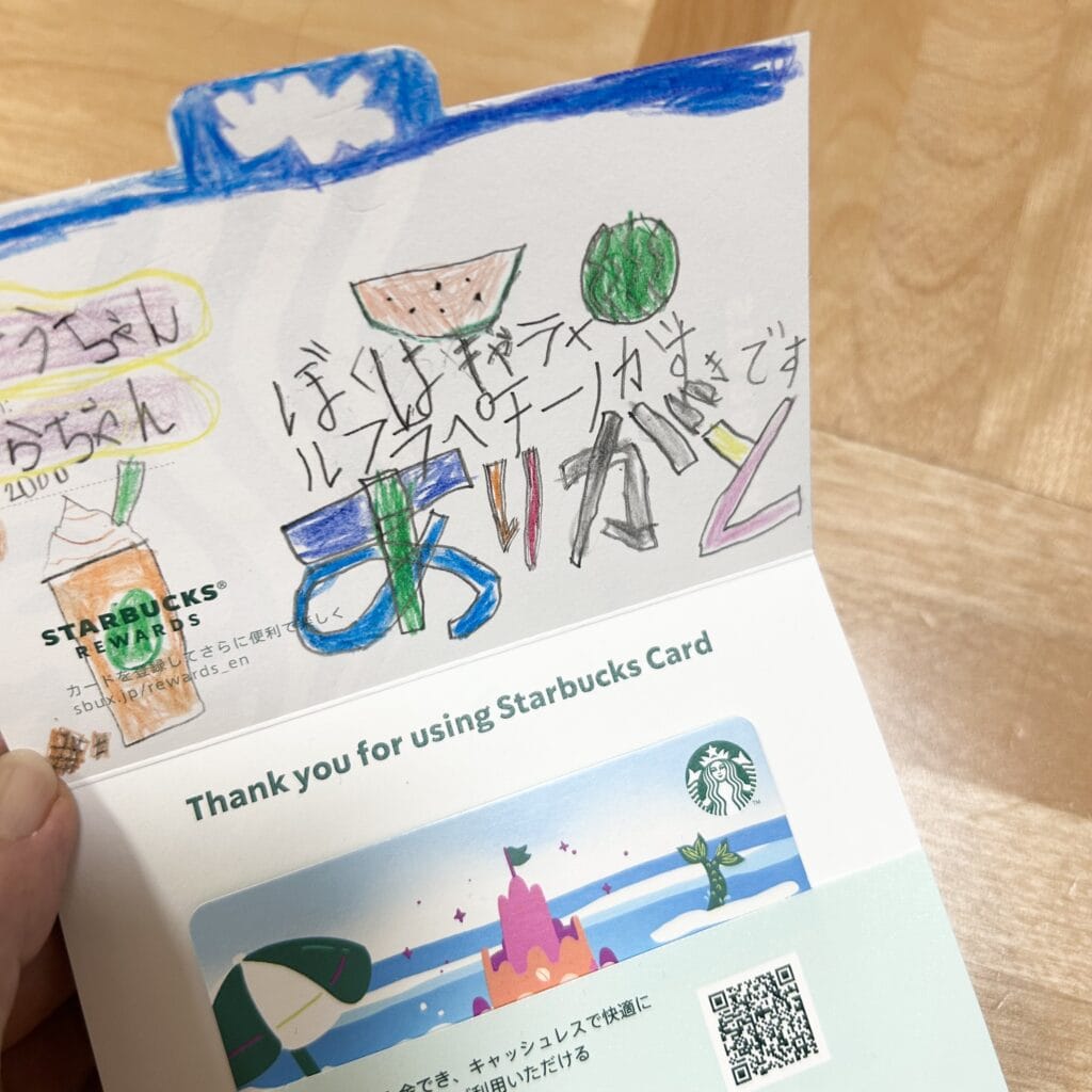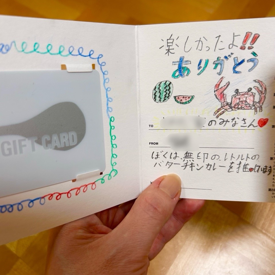 ギフトカードってちょっぴり味気ないかな?と思いつつ、子どもたちと一緒にお礼やイラストを書いていたらいつの間にかあたたかみのあるギフトに大変身♪