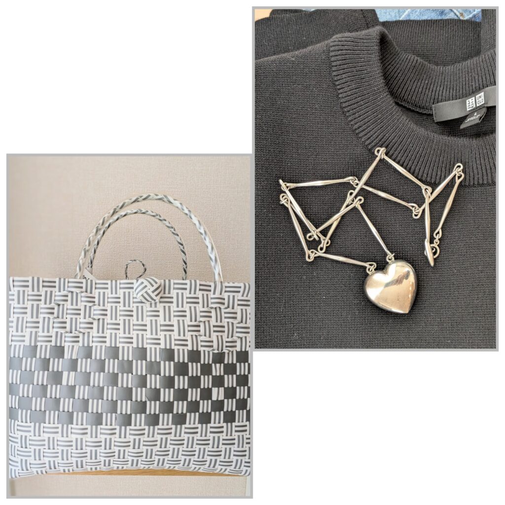 ボトムスはGUのハイライズストレートジーンズを合わせました。そして、アクセントにしたのが、台湾で購入したかごバッグとヴィンテージのシルバーのアクセサリーです。