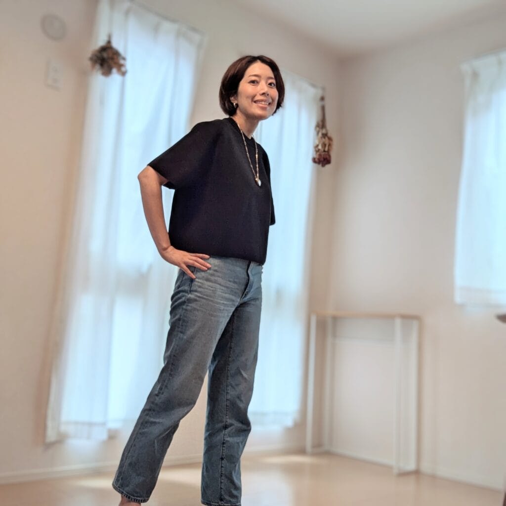 サイズは、クロップド丈だったのでパンツと合わせることを考えてLサイズを選びました。スカートだとMサイズでもいけたんだろうけど、パンツメインだと少し丈が短く感じたので、ワンサイズ上げて正解でした!肉感を拾わないゆったりとしたシルエットも◎。