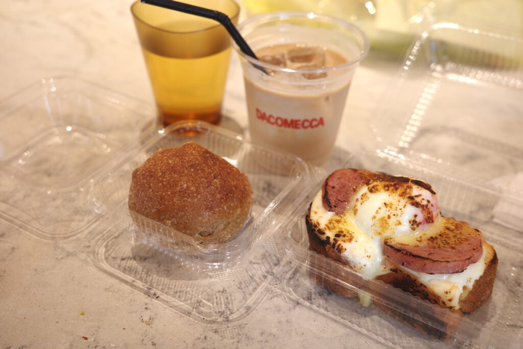 奇跡的にあいた席をあきさんが間一髪でkeepしてくれたおかげで、諦めかけていたイートインが叶って、うれしい🥹 わたしは欲張ってクロックマダムとイチヂクバターのふわふわパンの2つをチョイスしました。