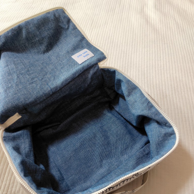 表のネコ柄は、トラネコボンボン 中西なちおさんのデザインされた【はじめてのお裁縫】という柄。おばさんも従妹も大のネコ好きなので、仲良し親子に喜んでもらえるかなと選びました。ちなみに内側の生地もオリジナルリネン混ダンガリーソフトという私の大好きな生地♡