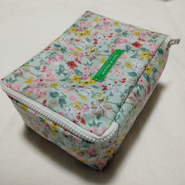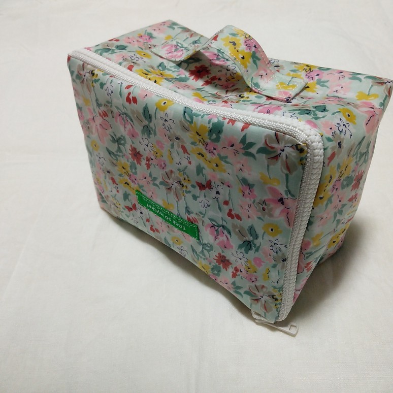 これは、2年前に試作で縫ったもの。小サイズをビニールコーティング生地で作り、中にポケットを付けてみました。(あと、蓋部分の柄の向きが上下逆だなと試作をして気づきました。)