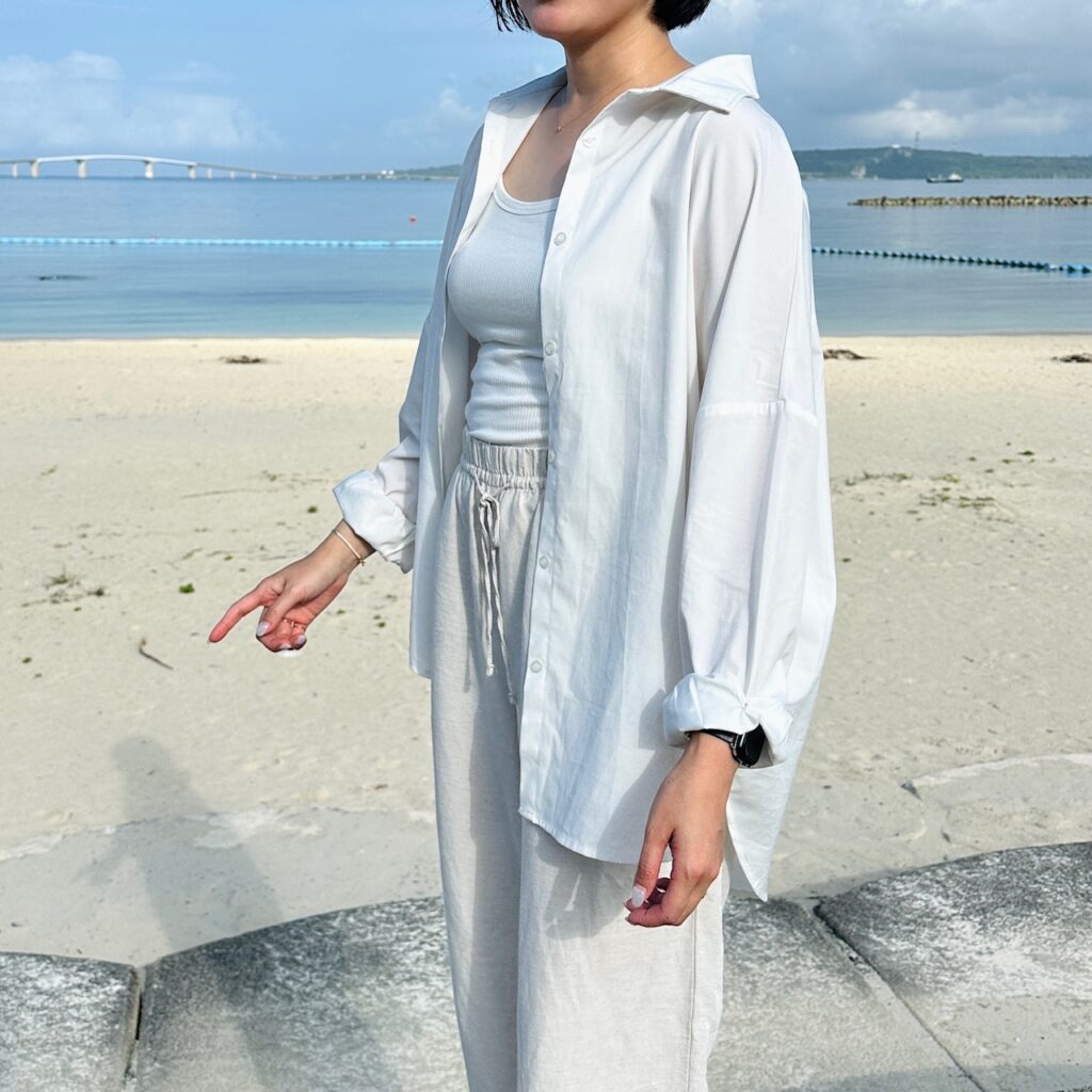 こちらも宮古島にて。海に入っている間は別のラッシュガードを着ていますが、そのままではビチャビチャで帰れない!そのため、海から出たらラッシュガードをこのシャツにチェンジ。(ちなみにラッシュガードとはいえ水中は不向きだと思います)シャワーだけ浴びてサッと帰る!なんて時にも上は水着のまま、ショーツは普段のものに変えてボトムを合わせてシャツを羽織ってしまえば全然帰れます!(←語彙力笑)
