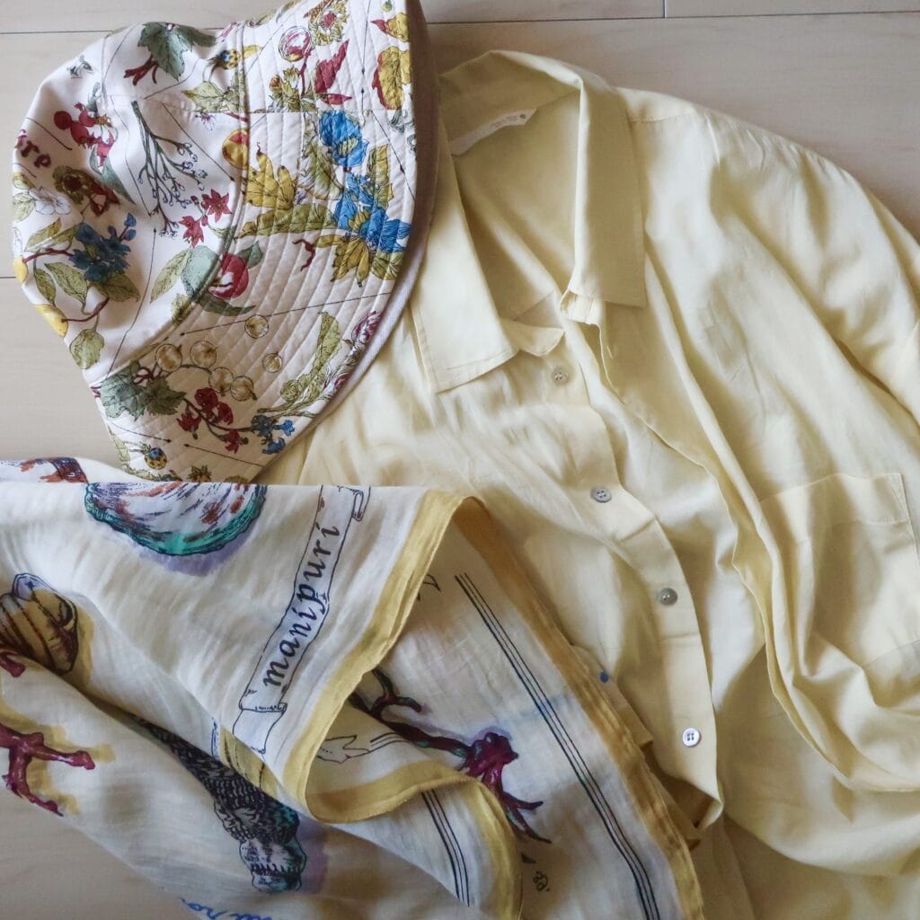 今季はリバーシブルのバケットハットと、貝殻モチーフのシルクコットンストールをゲットしました。