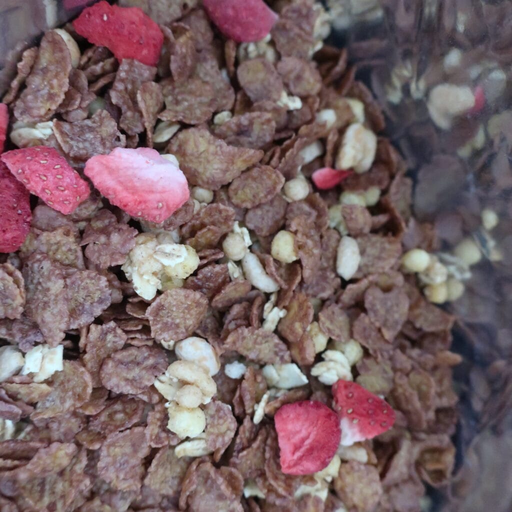袋を開けた瞬間、ごろっと大きな真っ赤なフリーズドライいちごがたっぷり。