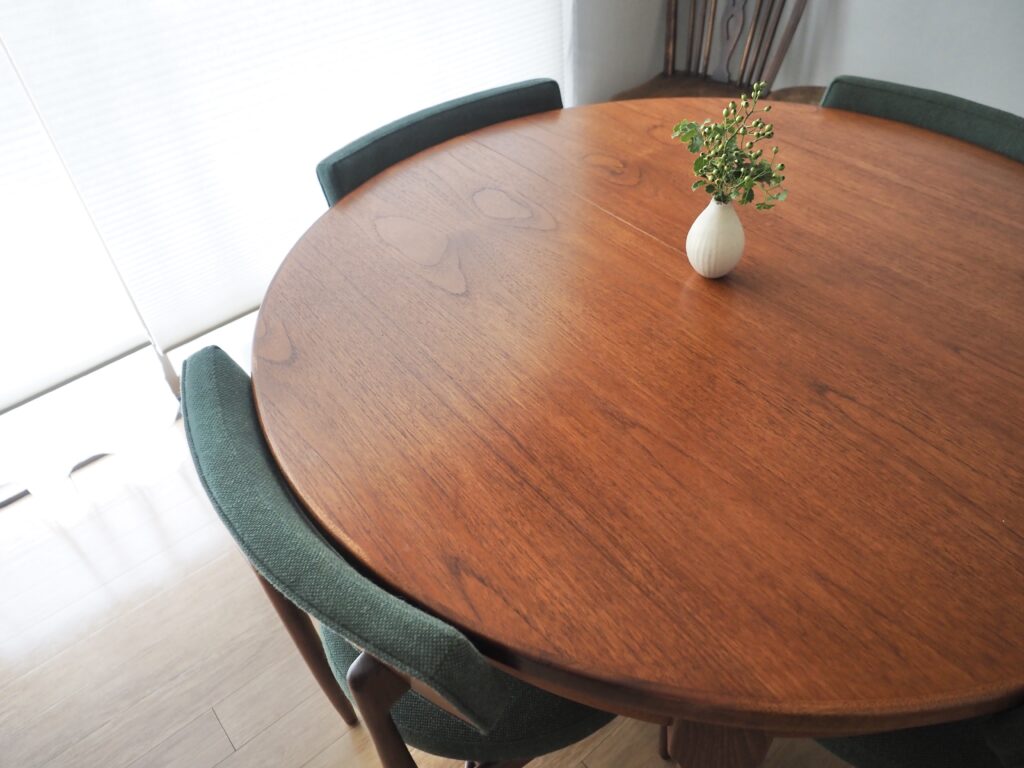 ビンテージ北欧家具を取り扱うtransista さんで購入。ずっと憧れていたチークの丸テーブルとG-Planの椅子。子供が大きくなり、大人用の椅子にも座れるようになったこのタイミングでお迎えしました!