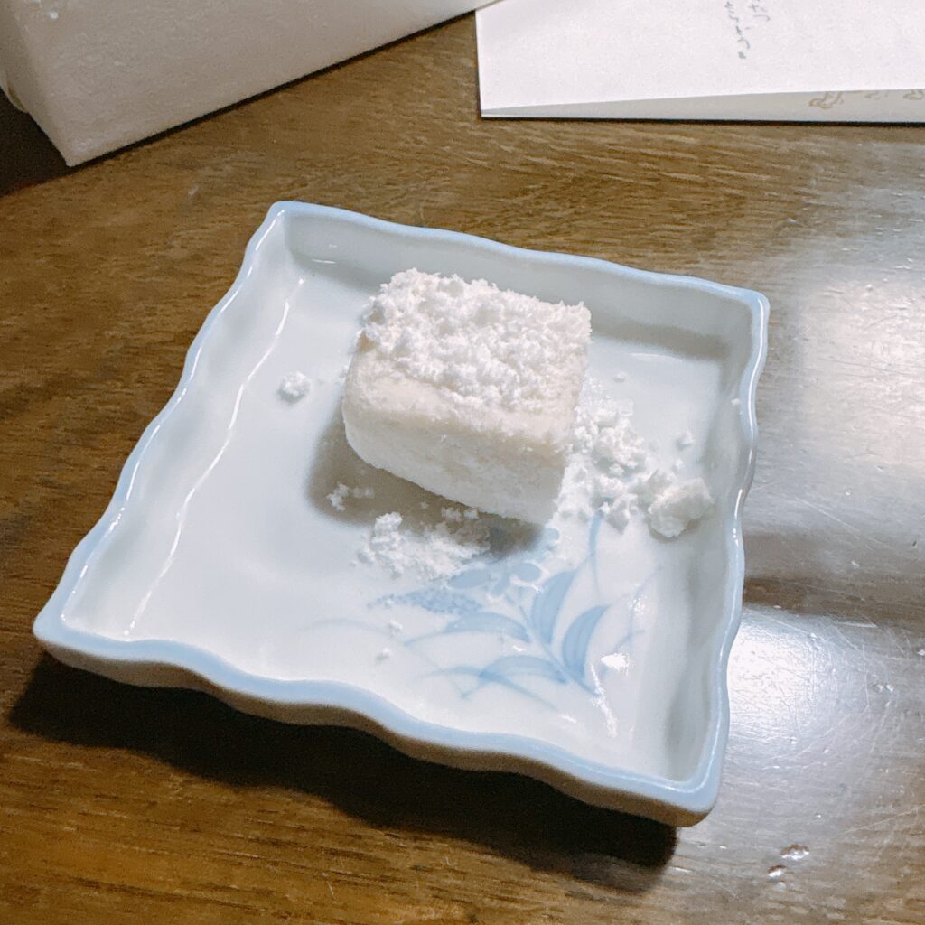 わらび餅が一切見えないくらいたっぷりまぶされたパウダーの中を、適当に付属のようじで刺してみると、きれいにカットされたわらび餅が姿を現しました。
