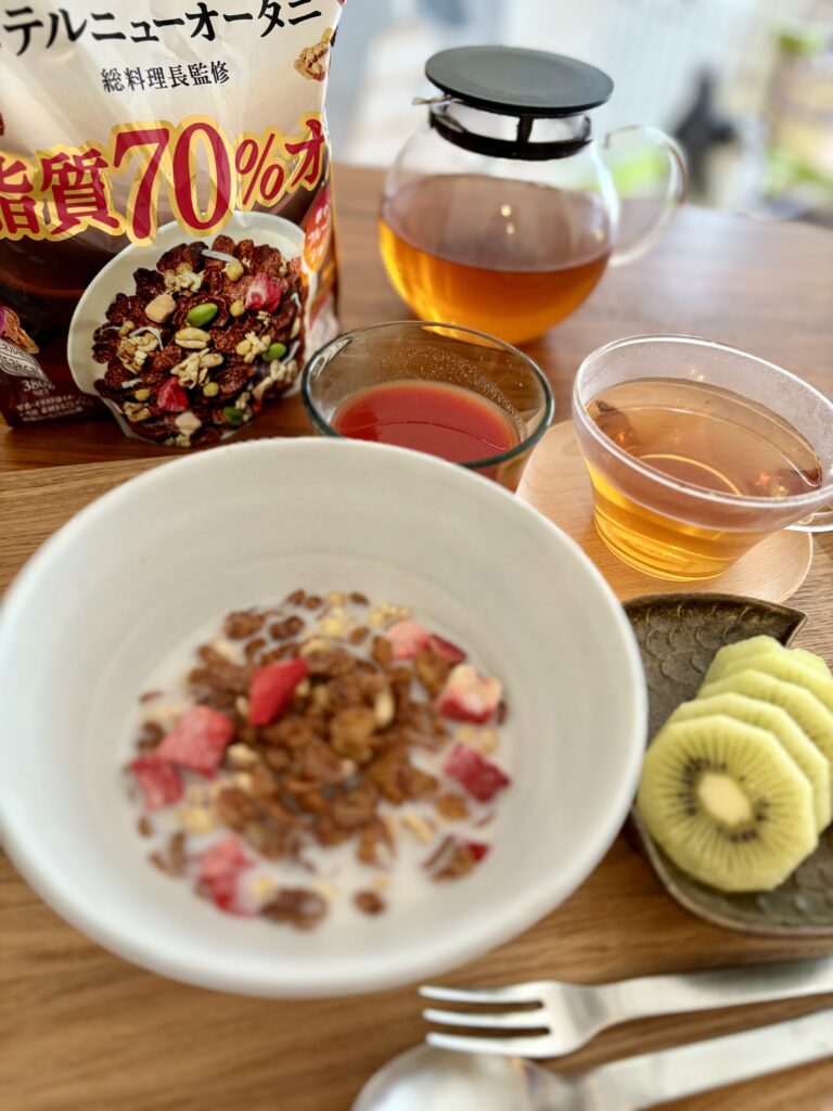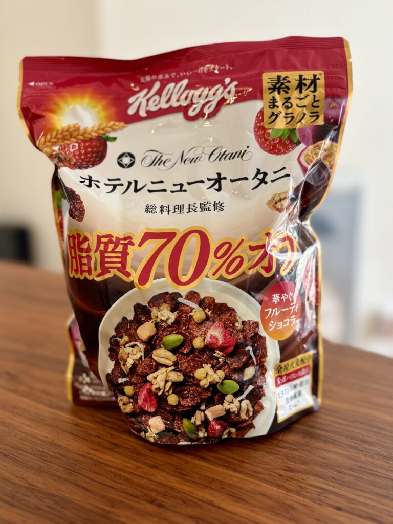 世界中の朝食を何世代にもわたり支え続けてきたケロッグから発売されている、ホテルニューオータニの総料理長が監修した、「素材まるごとグラノラ 脂質70%オフ 華やぐフルーティショコラ」!