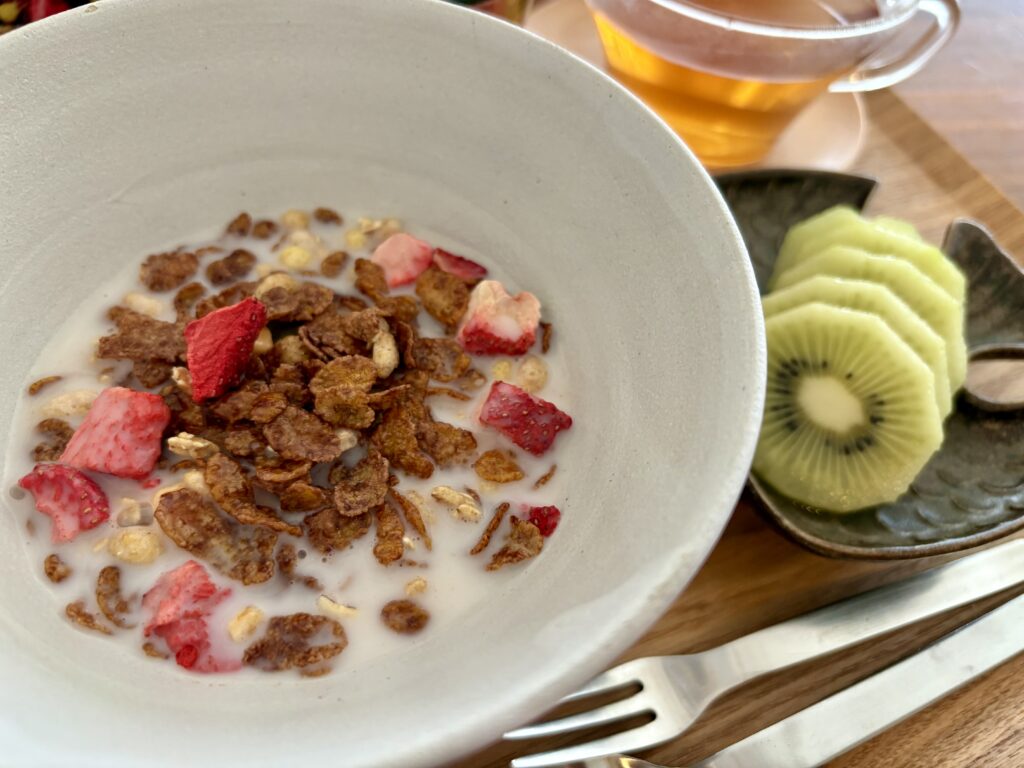 「素材まるごとグラノラ 脂質70%オフ」は香り高いチョコフレークと、甘酸っぱいザクザクのいちごやパッションフルーツが同時に味わえて至福。