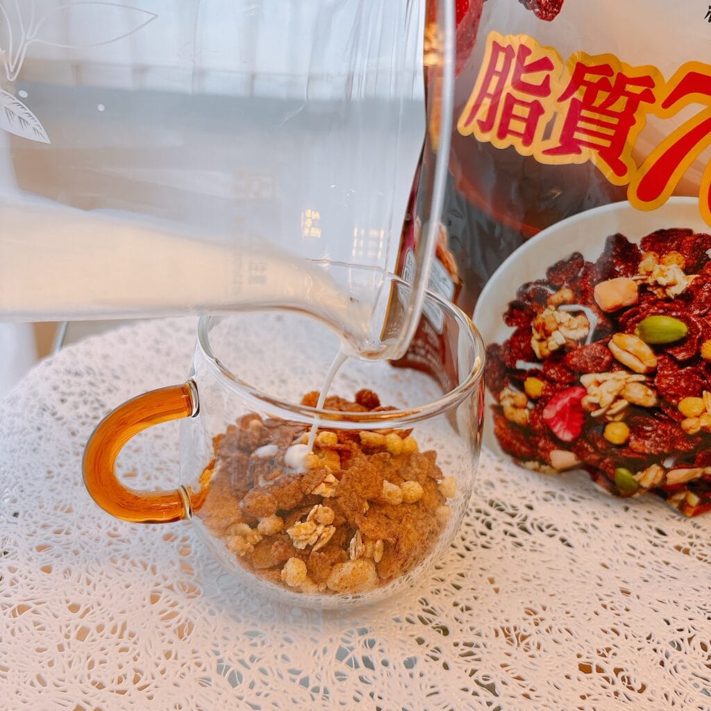 我が子たちは「素材まるごとグラノラ 脂質70%オフ 華やぐフルーティショコラ」が大好き♡まずはサクサク食感、時間が経って牛乳に浸ってしっとり感、そしてグラノラを食べ終わった後にチョコレート風味になった牛乳が最後のお楽しみに♪