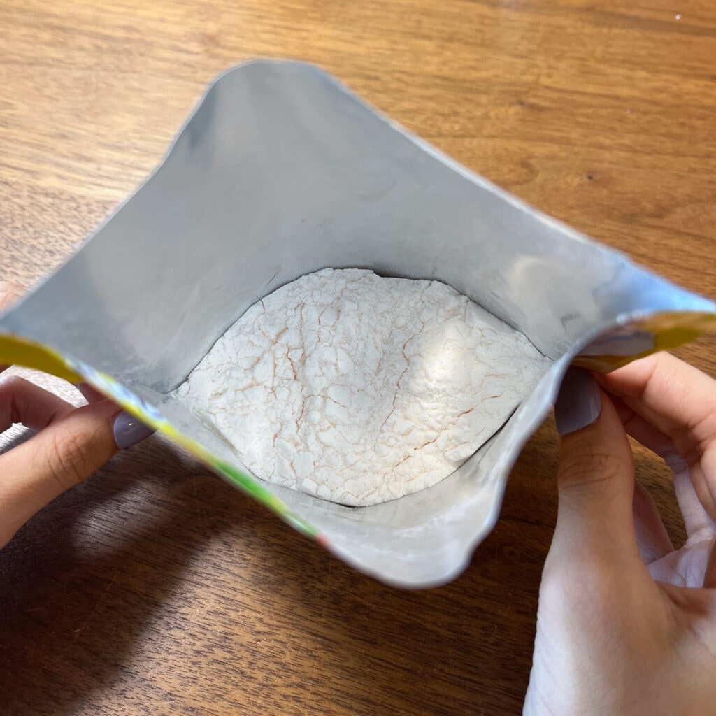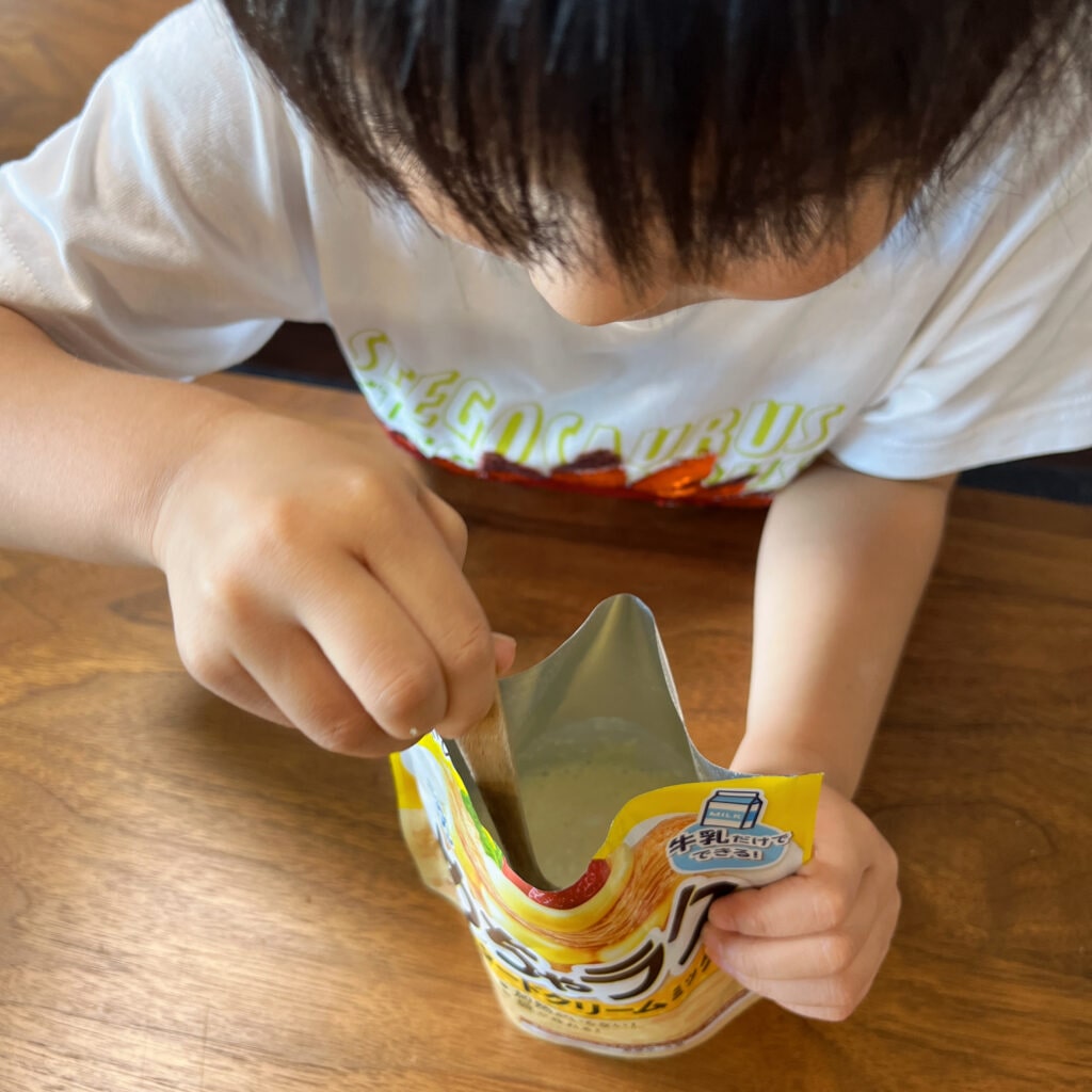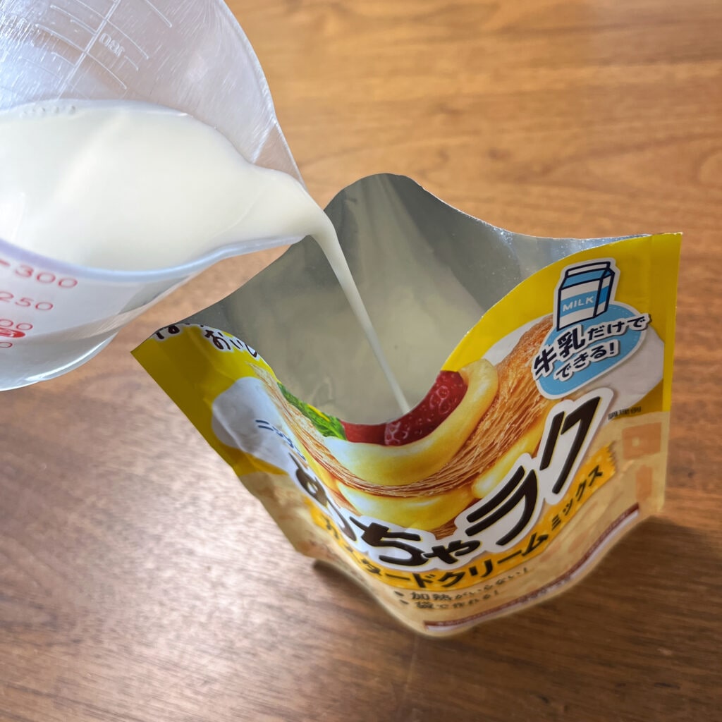 まずは、このカスタードミックスの中に、牛乳を入れます。