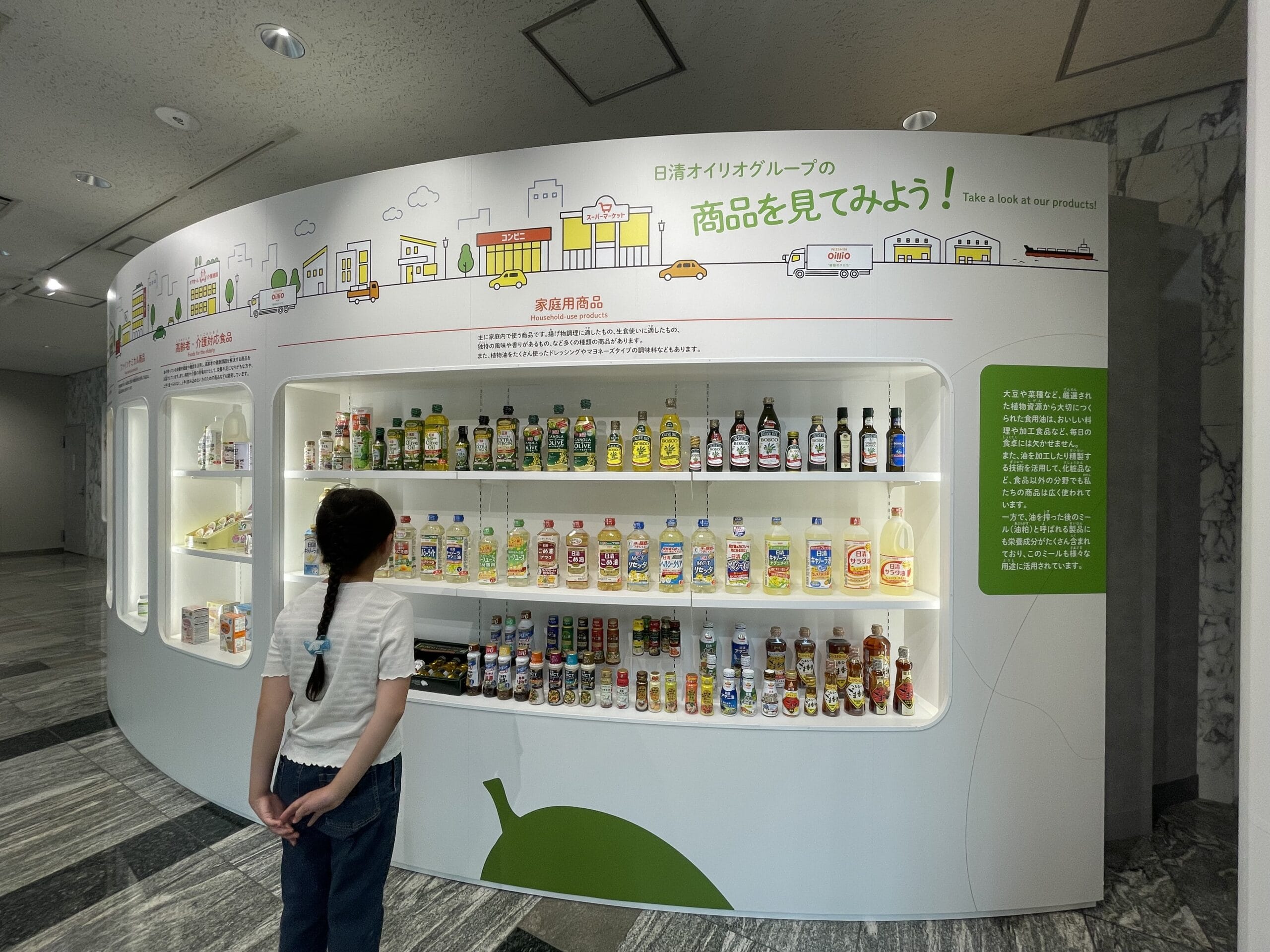 いつも工場見学の時、特に車で移動する時は道路の渋滞なども考慮して、かなり早めに家を出るので(子ども達に身支度を急かすのが毎回毎回大変です…笑)、少し早く到着します…。この日も、15分ほど早く現地に着いたので、工場見学受付の玄関口である、「日清オイリオ あぶらミュージアム」の体験型展示をアレコレ眺めて予習しました。こちらの「あぶらミュージアム」、今年の2月にリニューアルオープンしたばかりの新しい展示施設なんです。