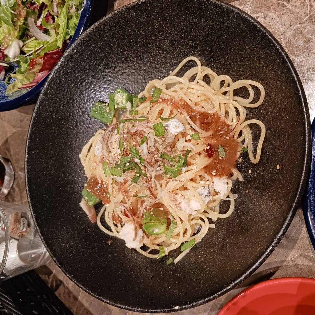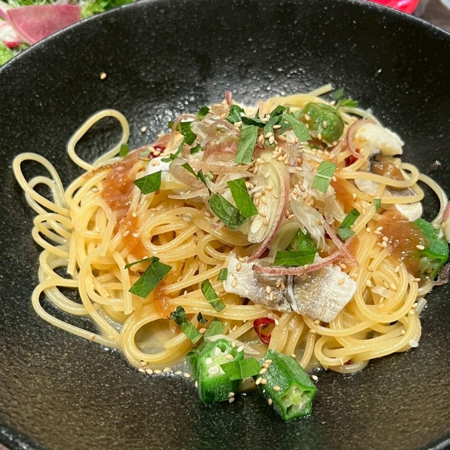 軽く炙った鱧とオクラ、香味野菜のスパゲティ