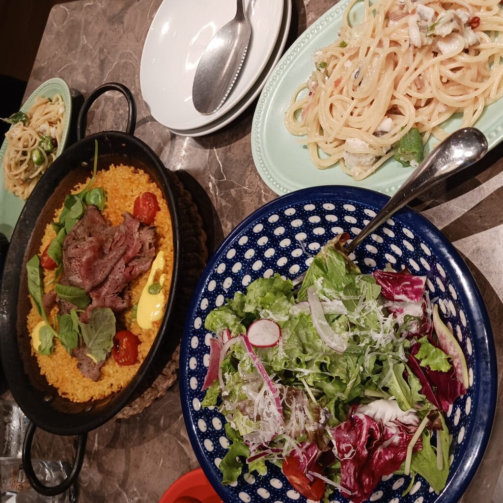 メニューも食べたいものばかりで悩んでしまいます!なのでシェアランチがちょうど良いかも😋この日はお目当てのパエリアと、パスタとサラダ&ドリンクセットを。サラダが結構ボリュームがあり嬉しいポイント!