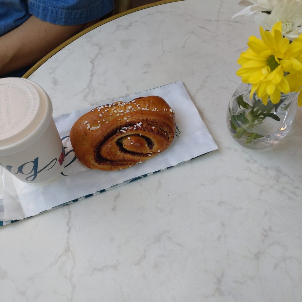 シナモンロールとコーヒーをテイクアウトで。気温は20℃ほど。外のテラスで食べるのが気持ち良い朝のモーニングです。シナモンロールはカルダモンとシナモンのバランスが良く、大き目で食べ応えがありです。
