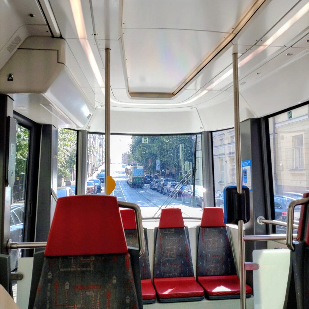 トラムから見るトラム。座席のファブリックが路線図。こういうところが北欧のデザイン性が出てますよね。