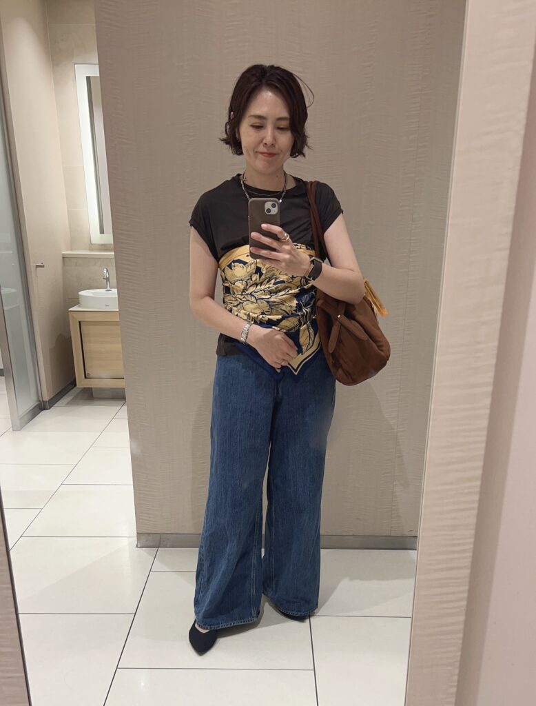 ダークブラウンのTシャツに最近購入したスメリーの大判スカーフをビスチェのように巻いてアレンジ。春に購入したHMのスエードバッグで少し重さを出してみました。色や小物で取り入れるのが暑くないし簡単♪