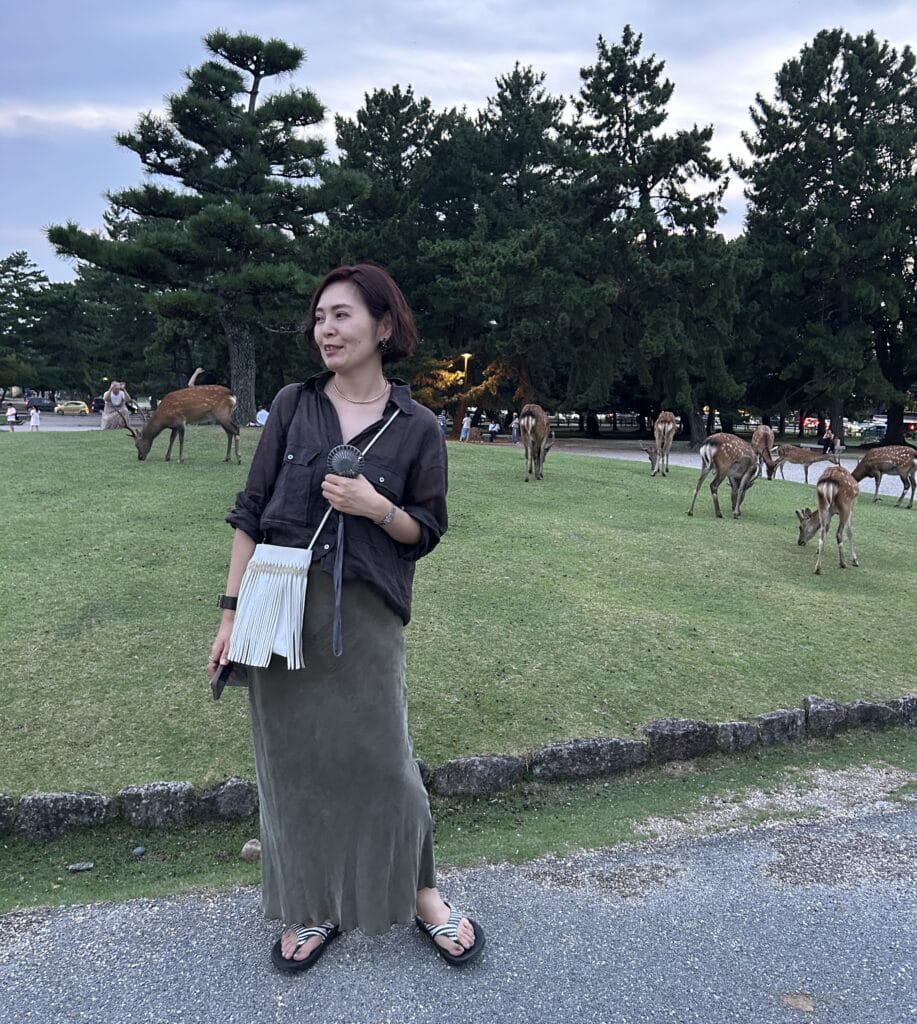 奈良の燈花会へ出かけたときのコーディネート。うまい具合に鹿と芝生とリンクしてます。笑