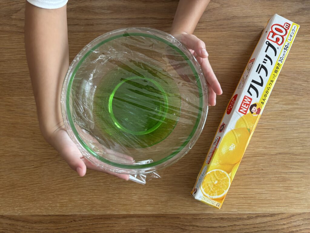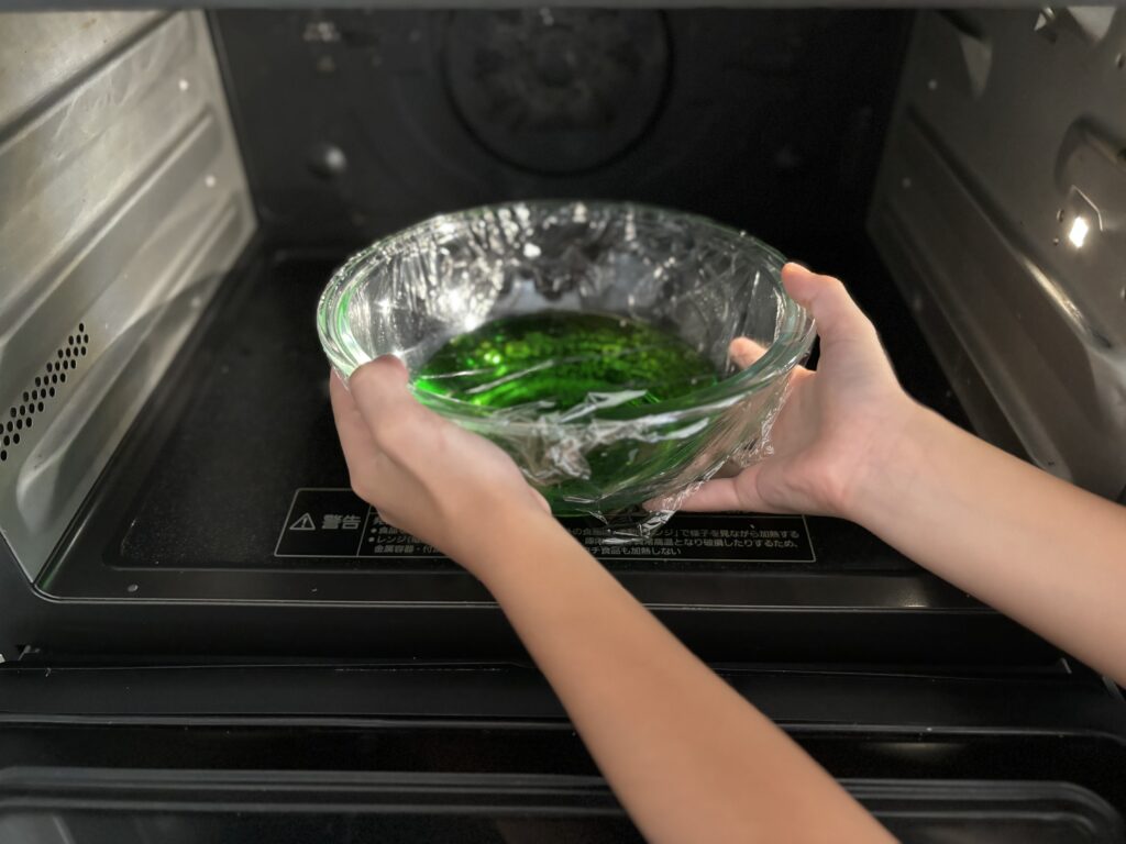 ラップをかけて電子レンジで約1分温めていきます。