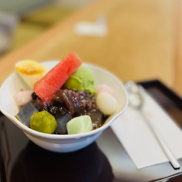 月ヶ瀬さんの歴史は、昭和元年(1926年)に四条河原町で開かれた一軒の京菓子司「若狭屋吉勝」が始まりです。そこで出されたあんみつやお善哉(ぜんざい)が評判となり、「あんみつの月ヶ瀬」と呼ばれるようになったのだとか。