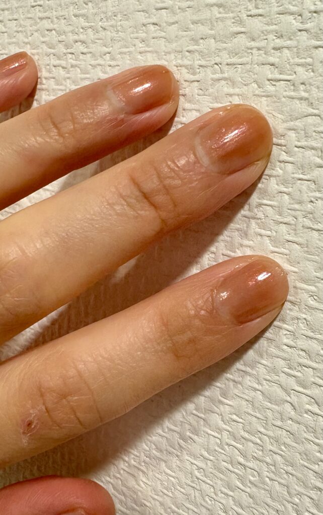 このネイルブランド、速乾で失敗が少なく大好きです。144番のオレンジゴールドです。