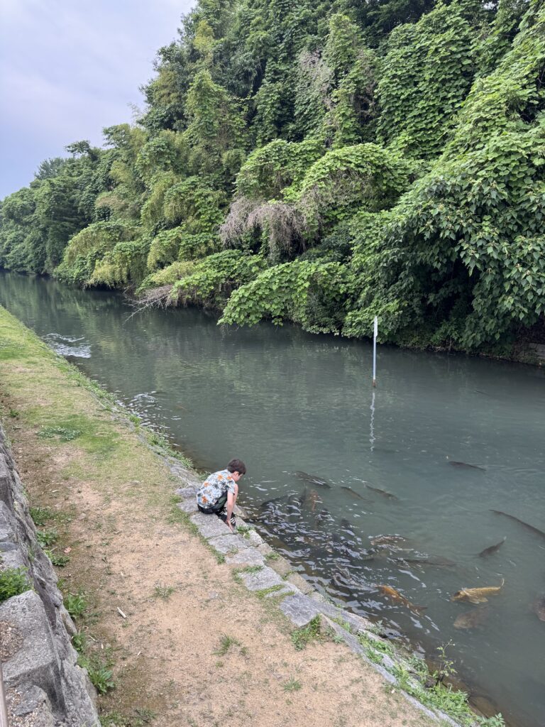 夕方になると、ご近所に住む方々が野菜のヘタやパンの耳などもって餌やりにきていました。 次男に野菜のヘタを渡してくれて、鯉の餌やりを一緒にさせてもらいました。