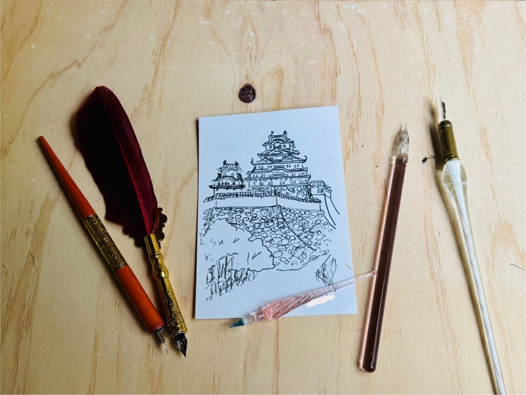 ガラスペンと墨でいざお城スケッチ!の絵は100均ガラスペンのご紹介の記事にチラッと登場しています。