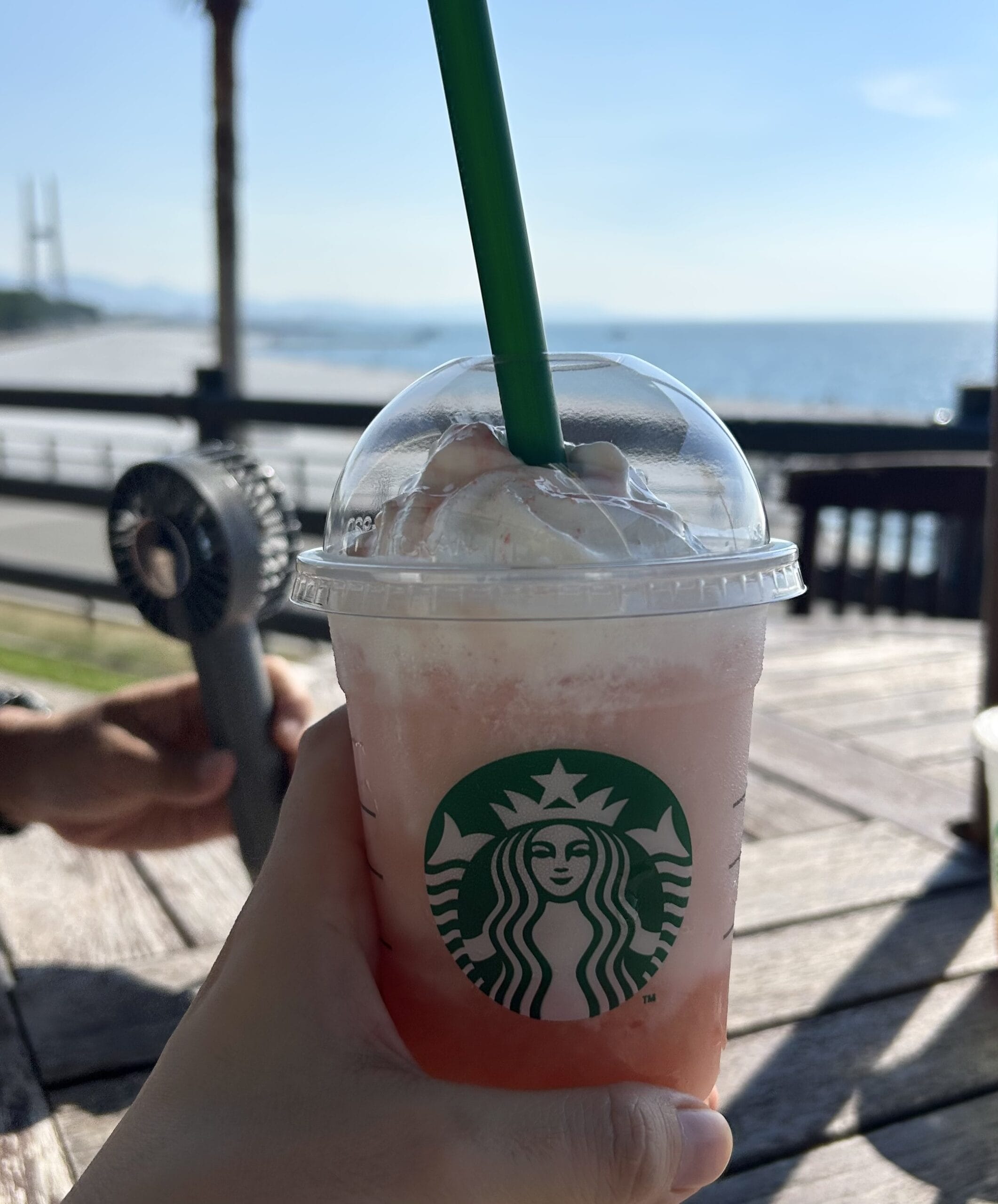 海沿いに自由に休憩できるスペースがあってゆっくりしながら飲みました。暑くてフラペチーノはすぐ溶けてしまいましたが笑
