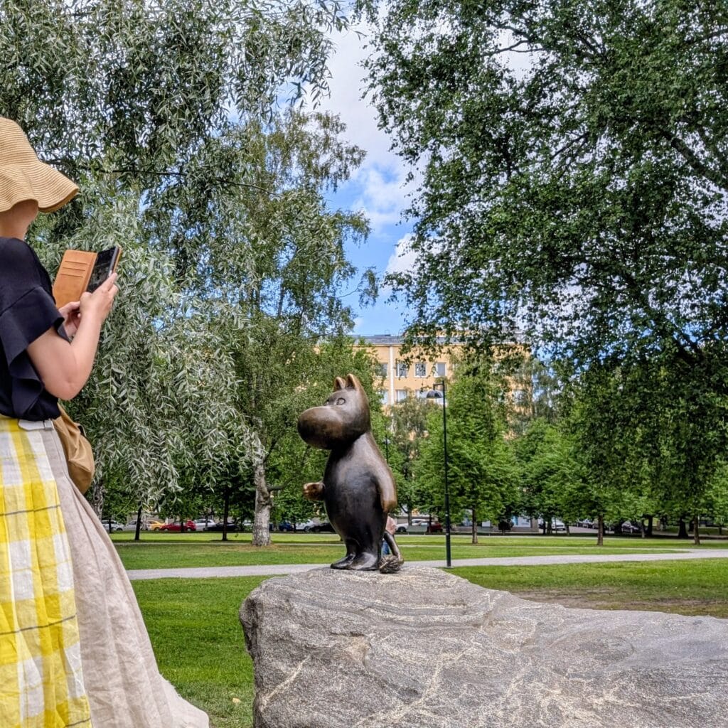 手前の広場にムーミンの銅像が。「やあ!」って話しかけるポーズのムーミン。