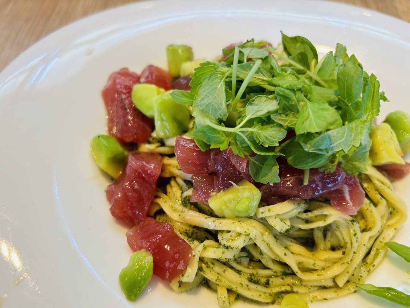 夫はマグロとアボカドの大葉バジルソースで、ノーマルなパスタよりちょっと太めのものを選んでいたのですが、自分のパスタに夢中でこれは名前をすっかり忘れてしまった…
