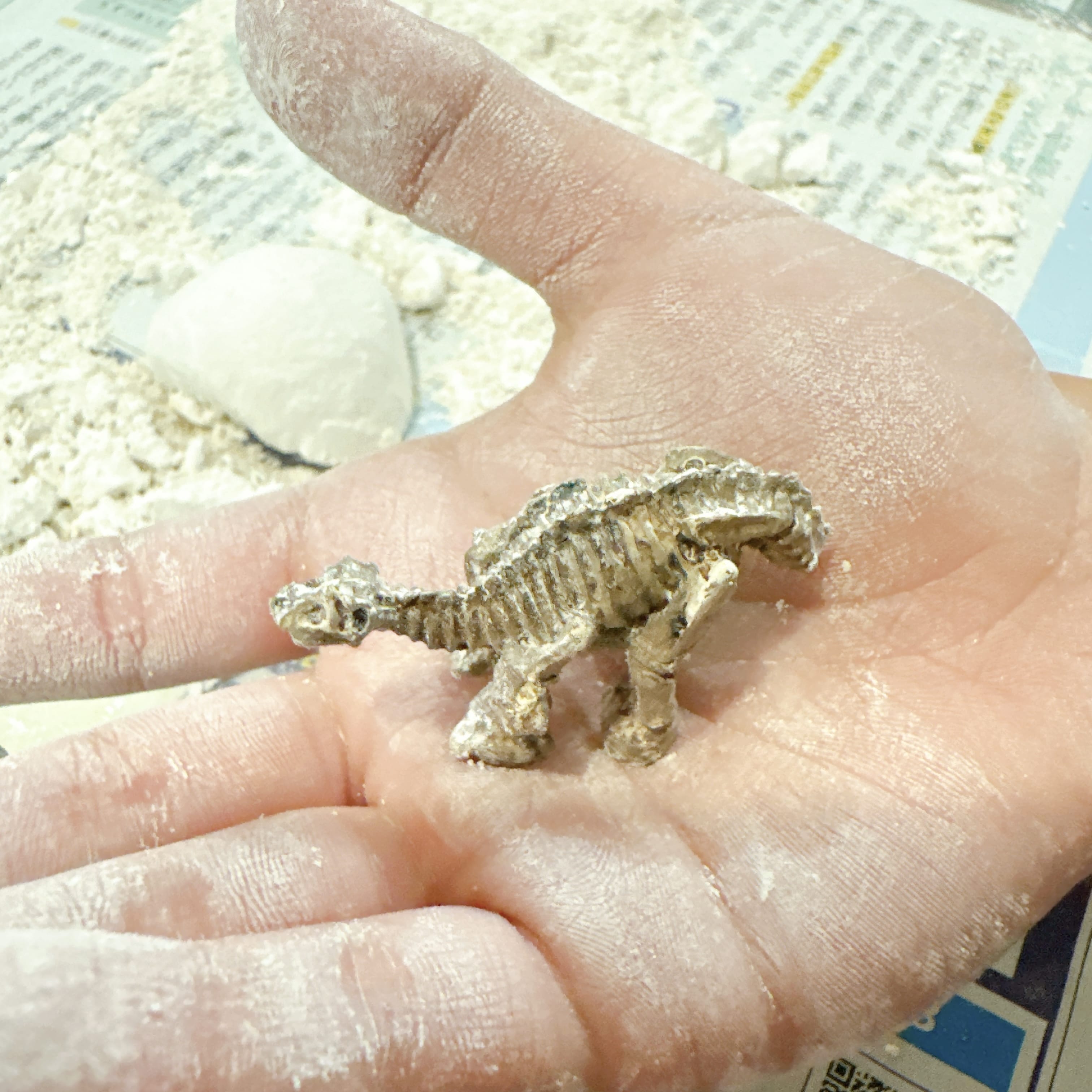 発掘棒で、少しずつ卵を削っていきます。石膏のような素材です。