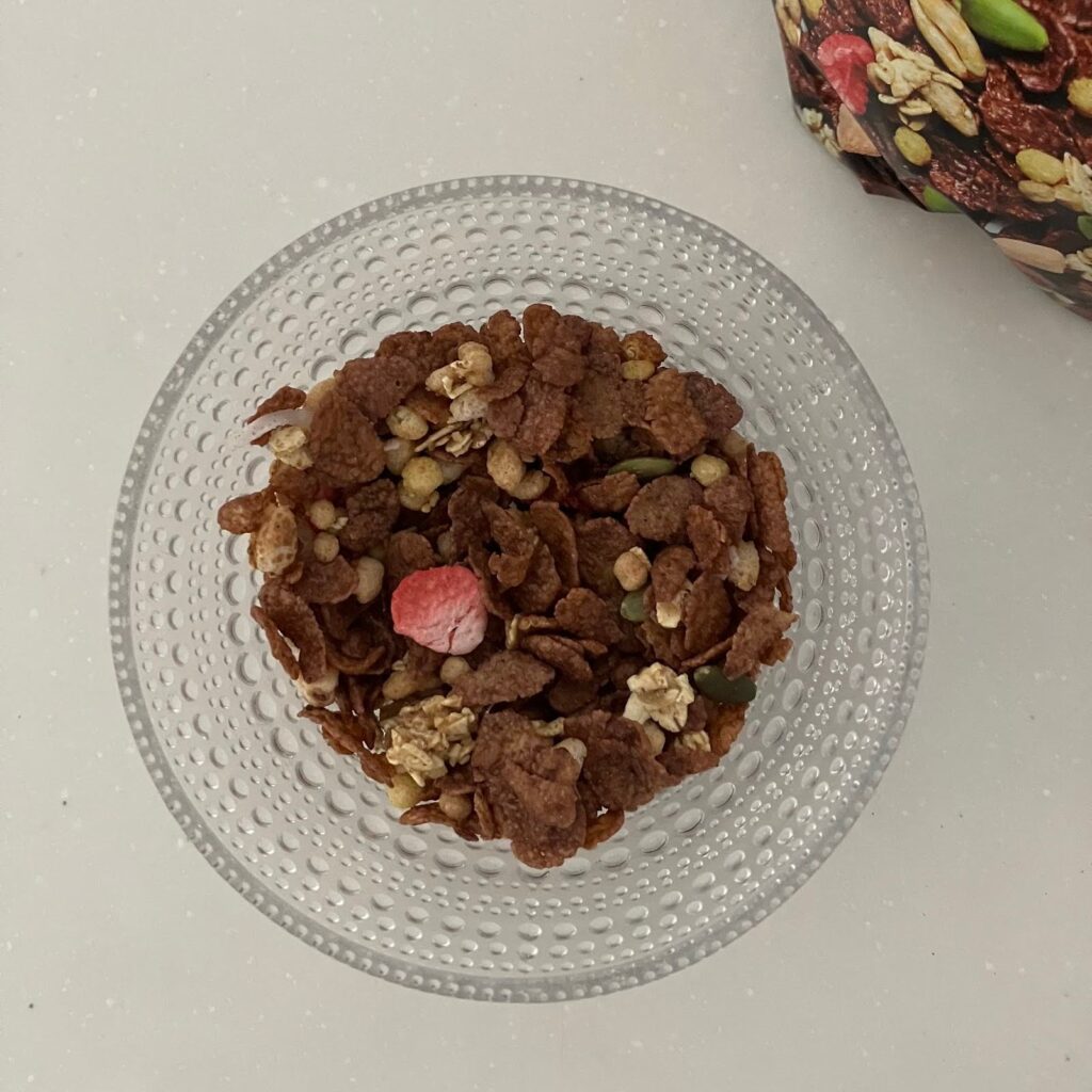豆乳などをかけるとチョコフレークがしっとりして朝でも食べやすく、最後は豆乳もチョコ風味になってラッキー感が得られます!笑