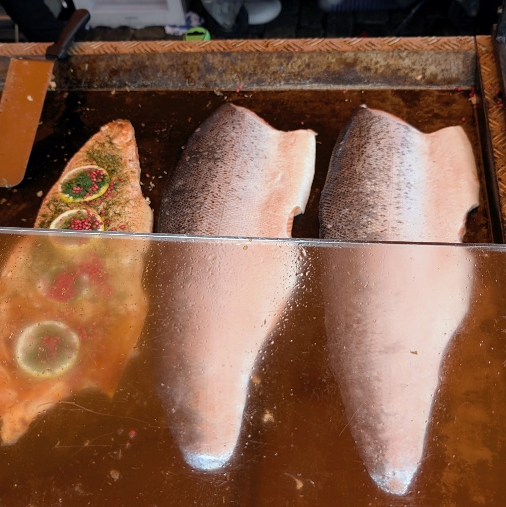 焼かれるサーモン。大きい!!! ピンクペッパーがポイントのようです。