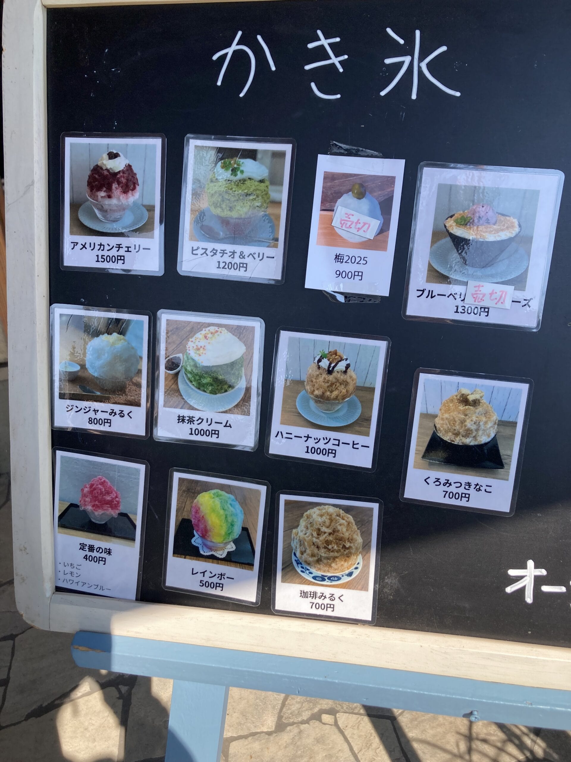 メニューはこちら。色々な種類のかき氷があり、迷ってしまいます。すでに売り切れていたものも。