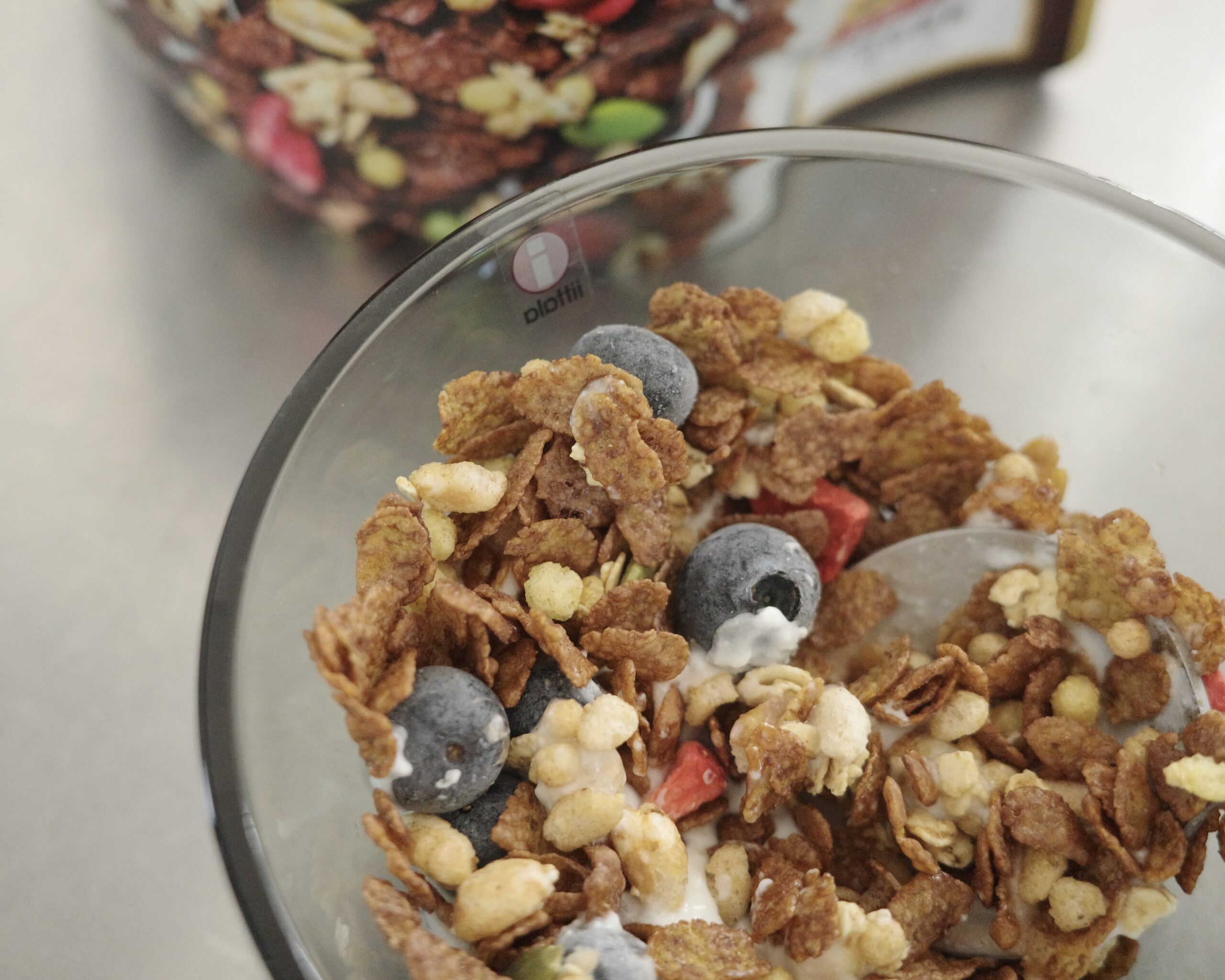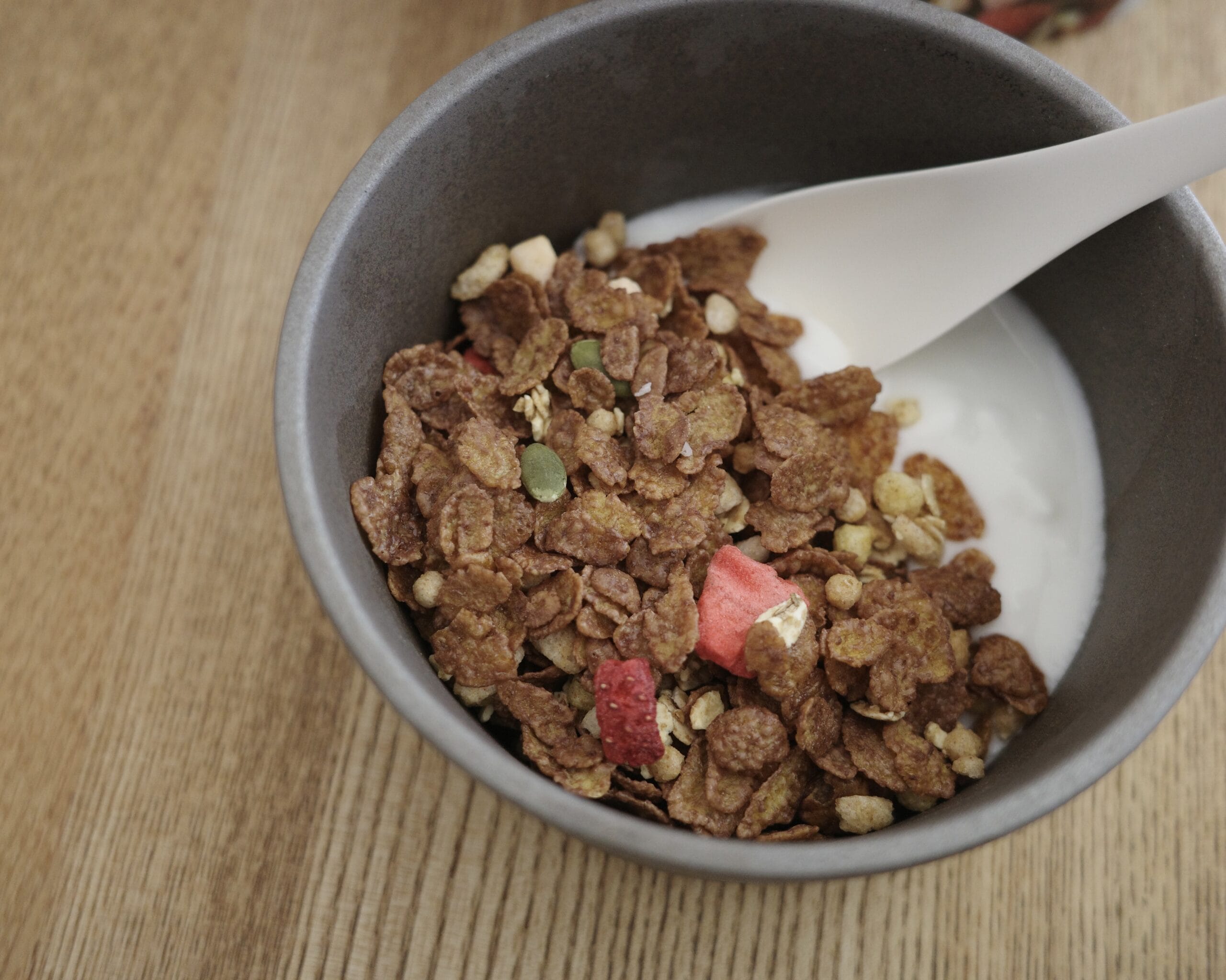 チョコフレークの甘さに全粒大麦の香ばしさ、フリーズドライいちごやかぼちゃの種のアクセントが合わさって、ひと口ごとにちがうおいしさが楽しめます。