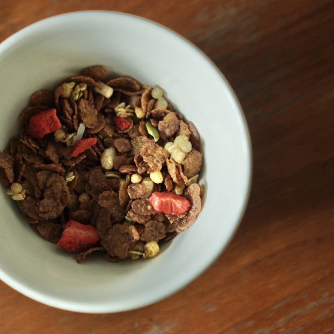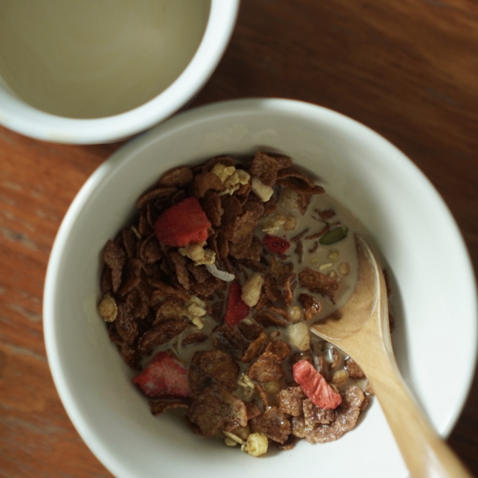 パッケージを見ると、チョコレートフレークに加えて、いちご、パッションフルーツ、ココナッツ、かぼちゃの種、とうもろこし、大麦、米、小麦と、たくさんの素材が入っていることが判明!