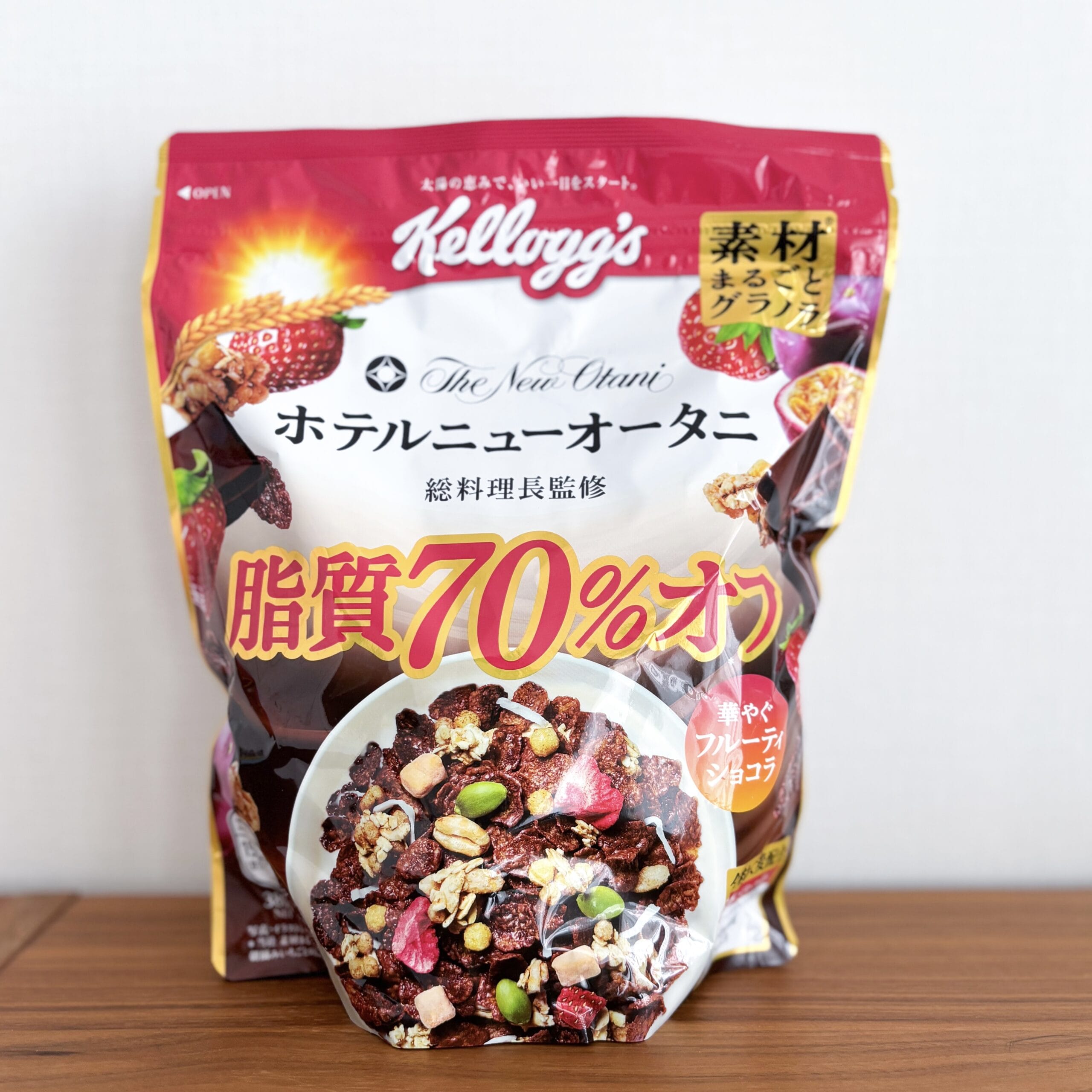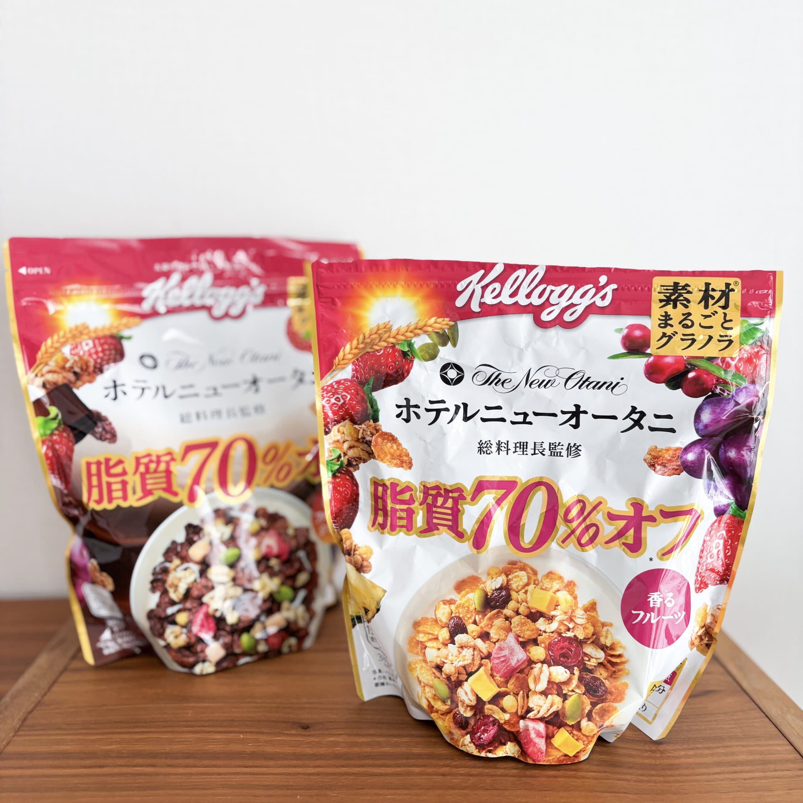 ケロッグの「素材まるごとグラノラ 脂質70% 香るフルーツ」というグラノラが好きです。切らさないように常にストックしています。