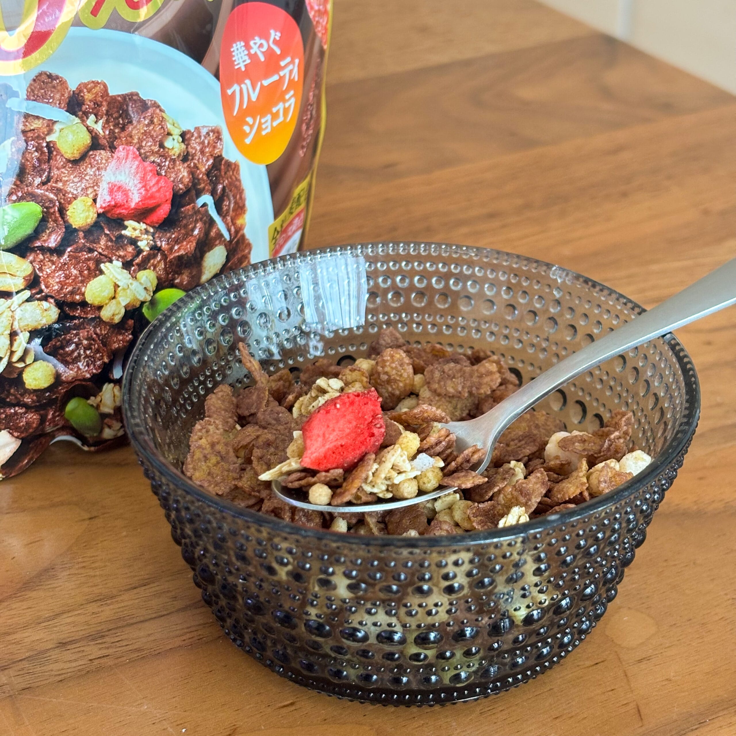 ちょっとお味見と思って、そのままポリポリと食べてみたら止まらなくなりました。普段はヨーグルトの上にかけて朝ごはんに食べていますが、「華やぐフルーティショコラ」は、何もかけず、そのままでおやつにしてもいいな。罪悪感の少ない健康的なおやつになりそうです。