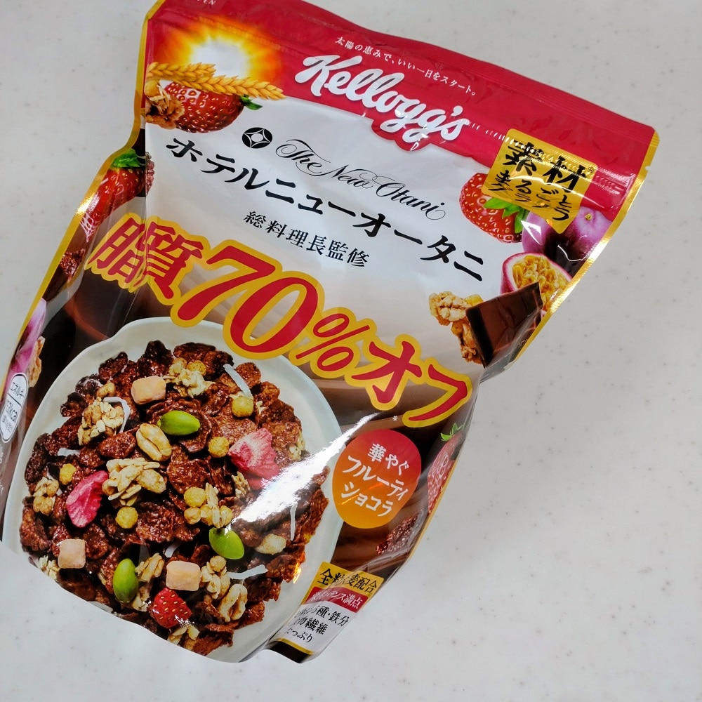 ホテルニューオータニ総料理長が監修されたというケロッグの、『素材まるごとグラノラ 脂質70%オフ 華やぐフルーティショコラ』をお試しさせていただきました。