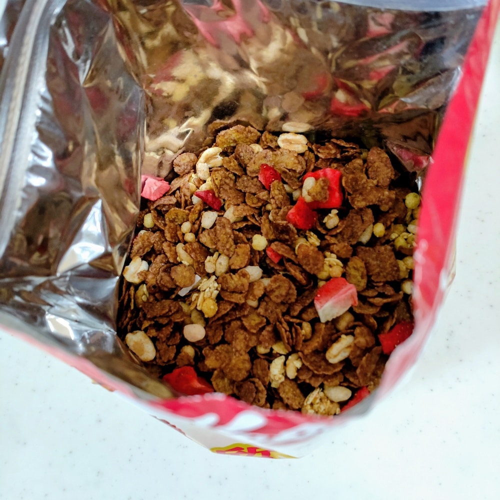 さっそく開封! ふわ~と甘いチョコの香りが漂います。フリーズドライフルーツも入っていて色合いも良し!第一印象は高評価です。